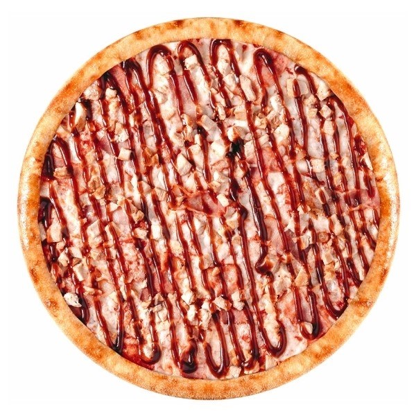Тесто, сливки, моцарелла, грана падано, куриное филе, помидоры, салат Айсберг, соус Цезарь