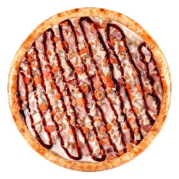 Тесто, сливки, моцарелла, ветчина, бекон, колбаски охотничьи, помидоры, шампиньоны, зеленый лук