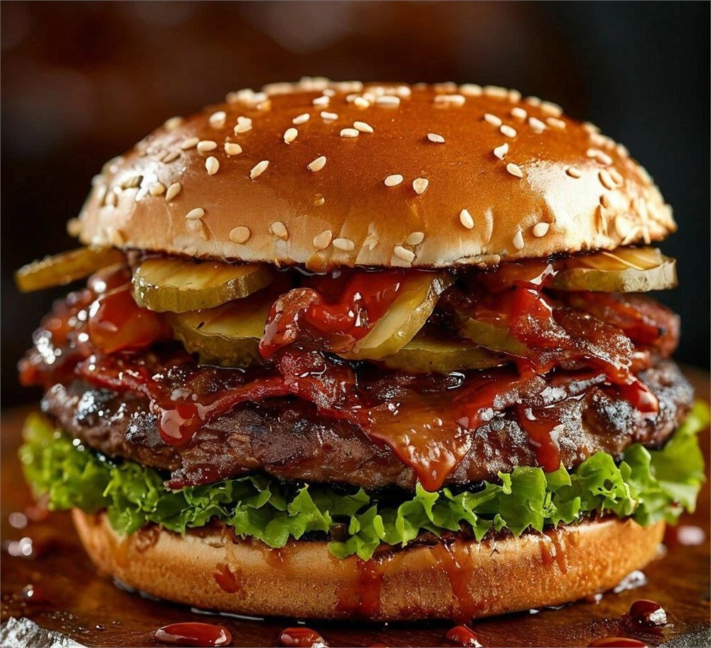 булочка,котлета говяжья,сыр чедер,бекон,лук красный,огурцы маринованные,соус барбекю