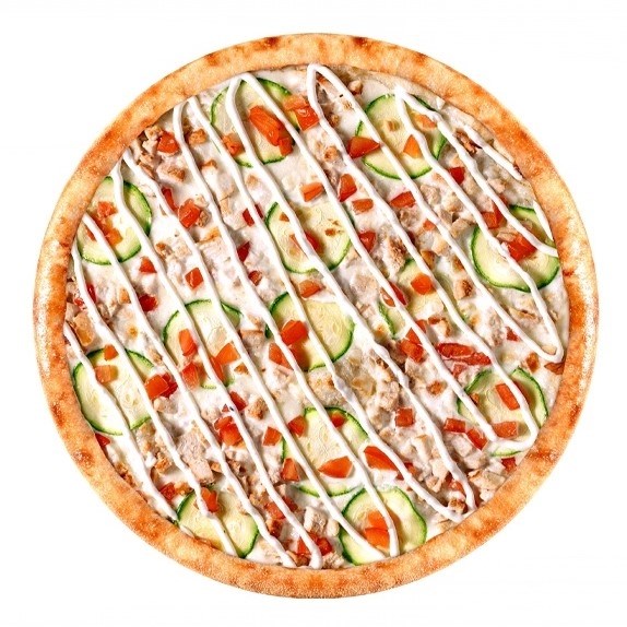 Тесто, сливки, сыр моцарелла, курица, помидоры, цуккини, соус чесночный