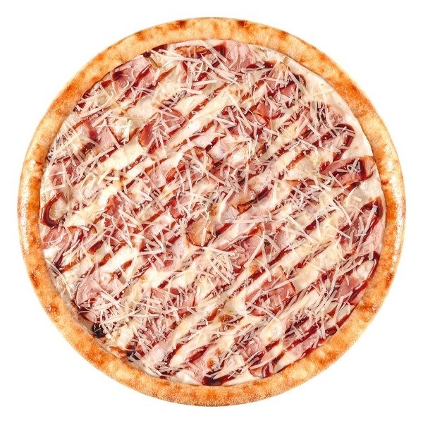 Тесто, сливки, моцарелла, бекон, ветчина, соус барбекю, грана падано
