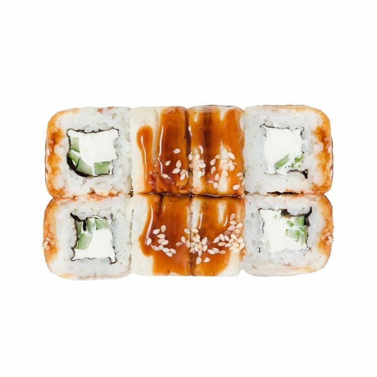 Рис, нори, сыр креметта, угорь, огурец, кунжут белый, соус унаги