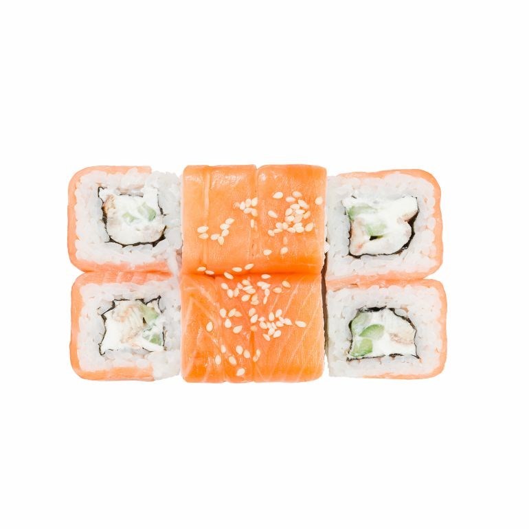 Рис, нори, сыр креметта, угорь, огурец, кунжут белый, лосось