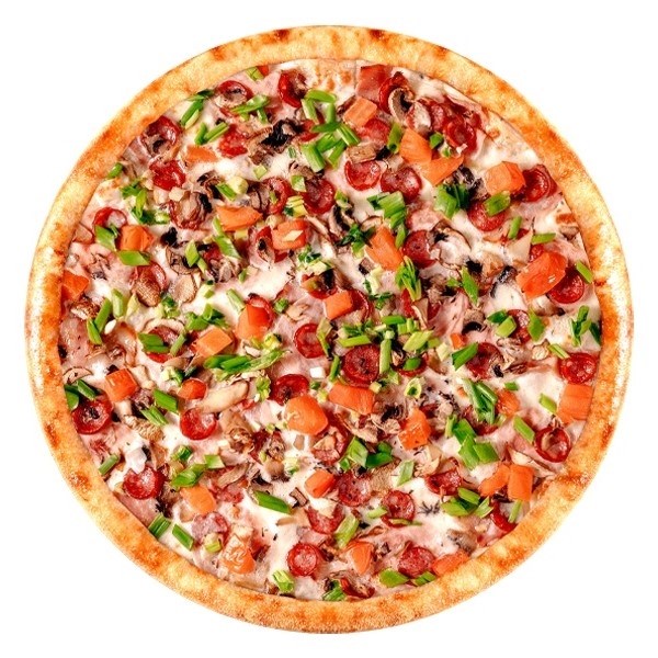Тесто, сливки, моцарелла, ветчина, бекон, колбаски охотничьи, помидоры, шампиньоны, зеленый лук