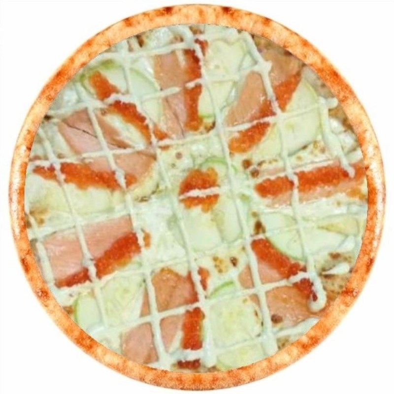 Тесто, сливки, моцарелла, лосось, цукини, соус чесночный, икра масаго зеленая