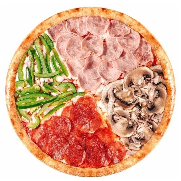 Тесто, томатный соус, моцарелла, пепперони, ветчина, перец болгарский, шампиньоны