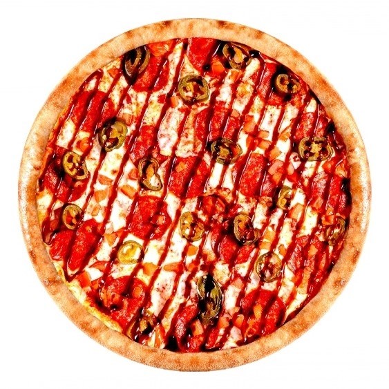 Тесто, томатный соус, сыр моцарелла, пепперони, помидоры, халапеньо, соус барбекю