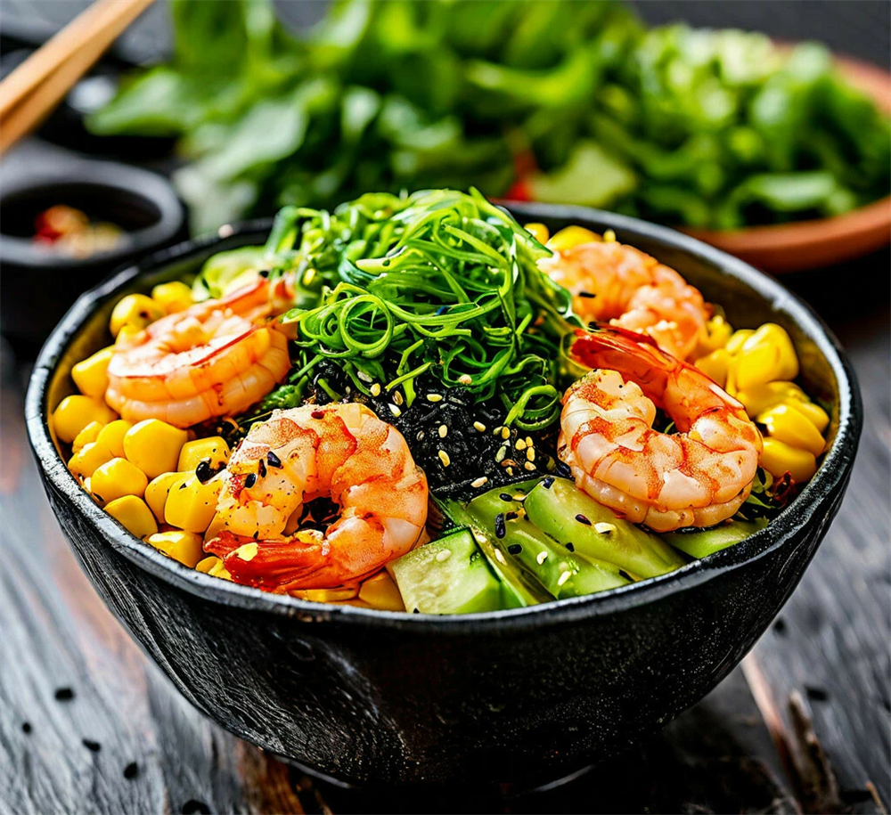 Креветка жареная, огурец, чука, икра масаго, нори, соус кунжутный, рис