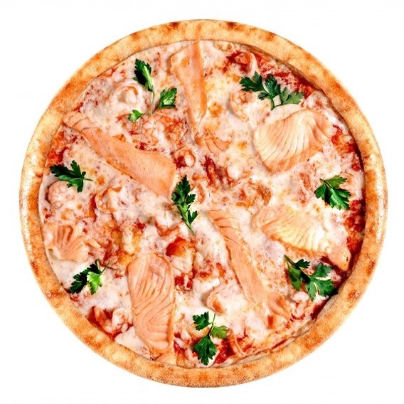 Тесто, томатный соус, сыр моцарелла, филе лосося, коктейльные креветки, петрушка