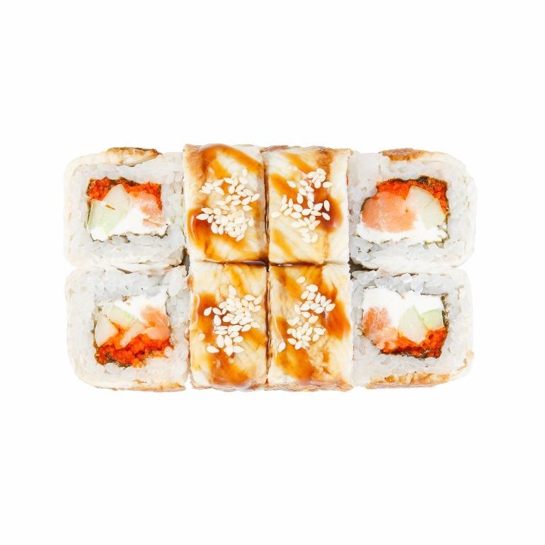 Рис, нори, сыр креметта, угорь, лосось, масаго оранжевая, кунжут белый, соус унаги