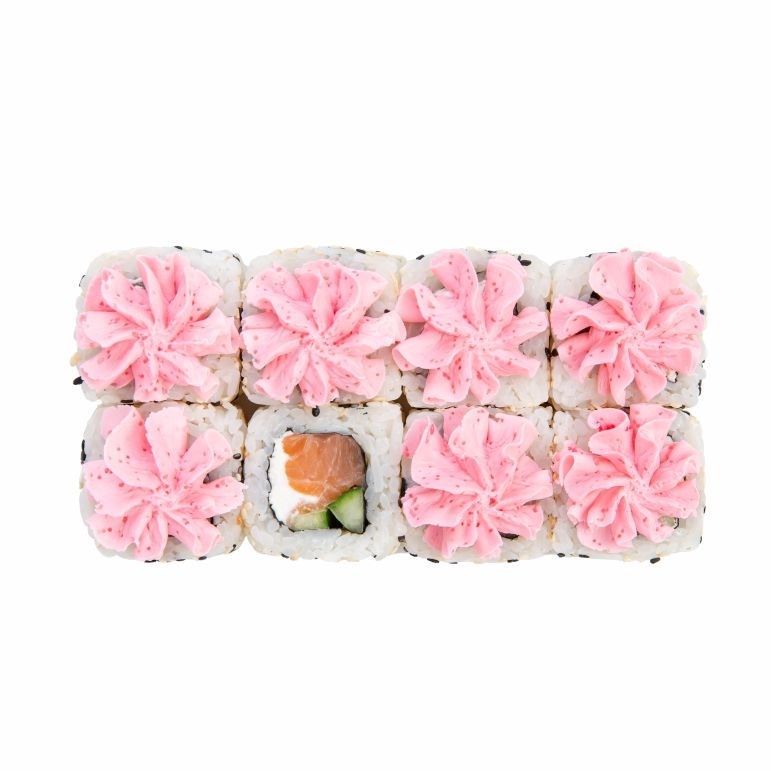 Рис, нори, огурец, лосось, сыр креметта, микс кунжута, розовый соус