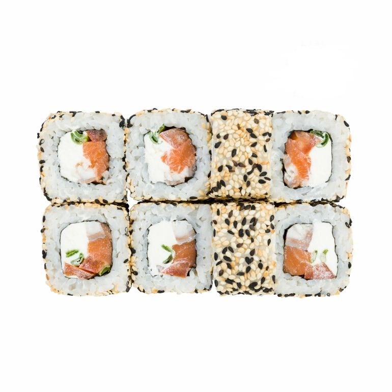 Рис, нори, сыр креметта, угорь, помидоры, лосось, лук зелёный, микс кунжута