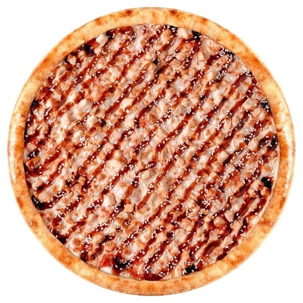 Тесто, томатный соус, моцарелла, куриное филе, соус терияки, кунжут белый