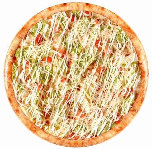 Тесто, сливки, моцарелла, грана падано, куриное филе, помидоры, салат Айсберг, соус Цезарь