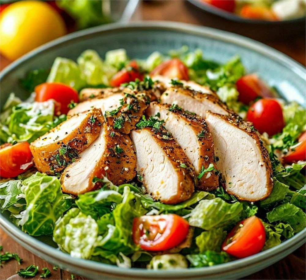 Салат айсберг, куриное филе, томаты черри, сыр пармезан, гренки, соус цезарь