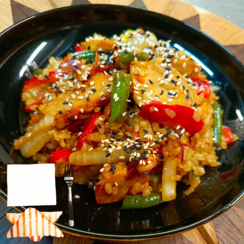 рис, курица, лук репчатый, фасоль, пекинская капуста, морковь, болгарский перец, чеснок, зелёный лук, кунжут